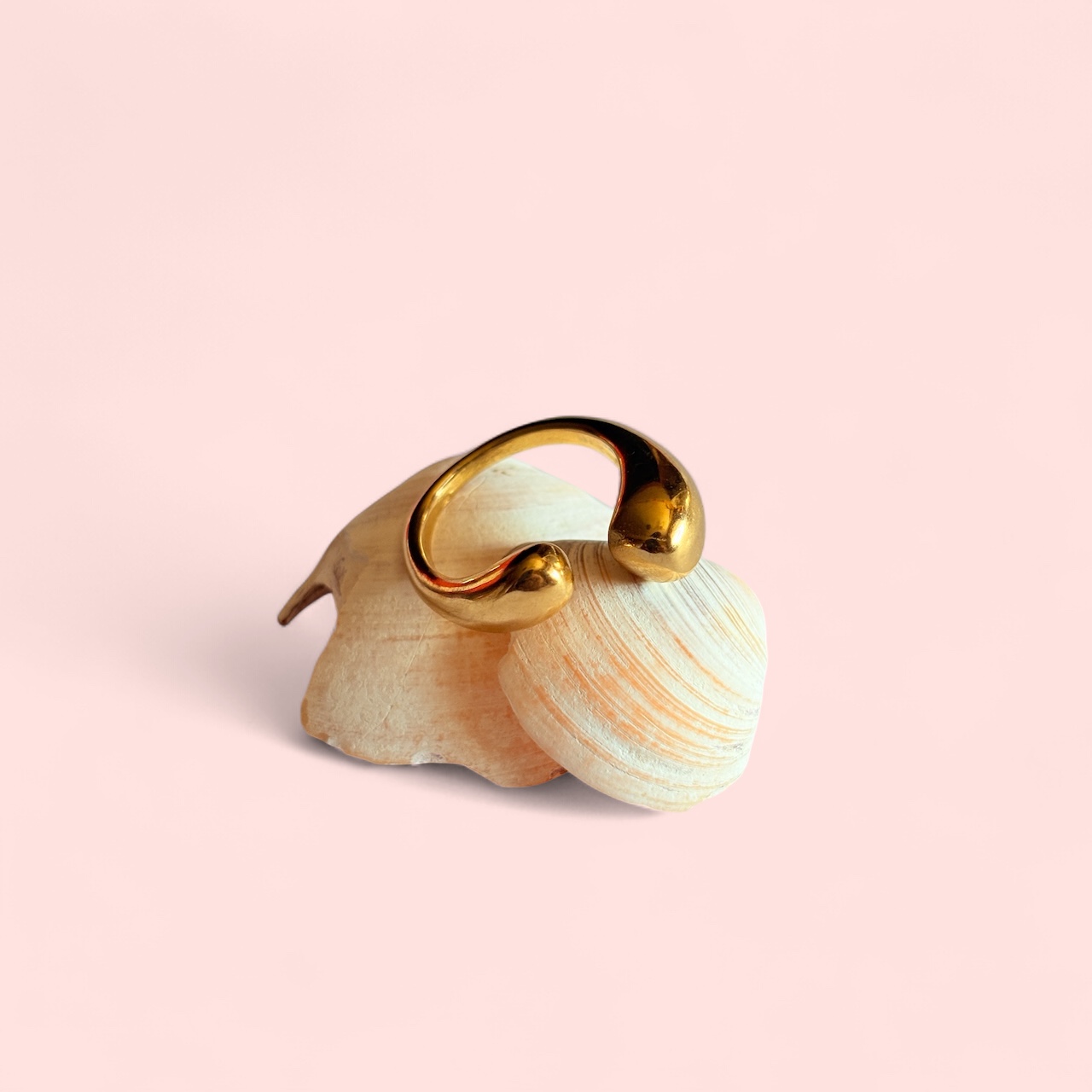 The Dew Ring captures the beauty of simplicity through its organic, open-ended design and smooth, reflective finish. With softly rounded ends resembling golden droplets, this piece adds an understated elegance to your everyday style. Its fluid shape offers a comfortable fit while exuding effortless sophistication. Whether worn alone or stacked with others, the Dew Ring brings a modern, minimalist charm to your jewelry lineup—like a drop of gold resting gracefully on your finger.