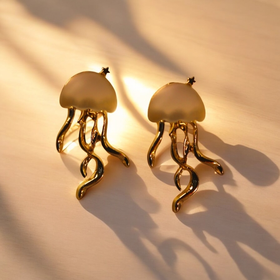 Dive into elegance with our Golden Jellyfish Dangle Earrings. Inspired by the graceful movement of jellyfish in the ocean, these earrings feature a soft matte dome paired with flowing gold-toned tentacles that shimmer with every turn. Lightweight yet striking, they bring a touch of marine magic to any outfit. Perfect for ocean lovers and bold fashionistas alike.