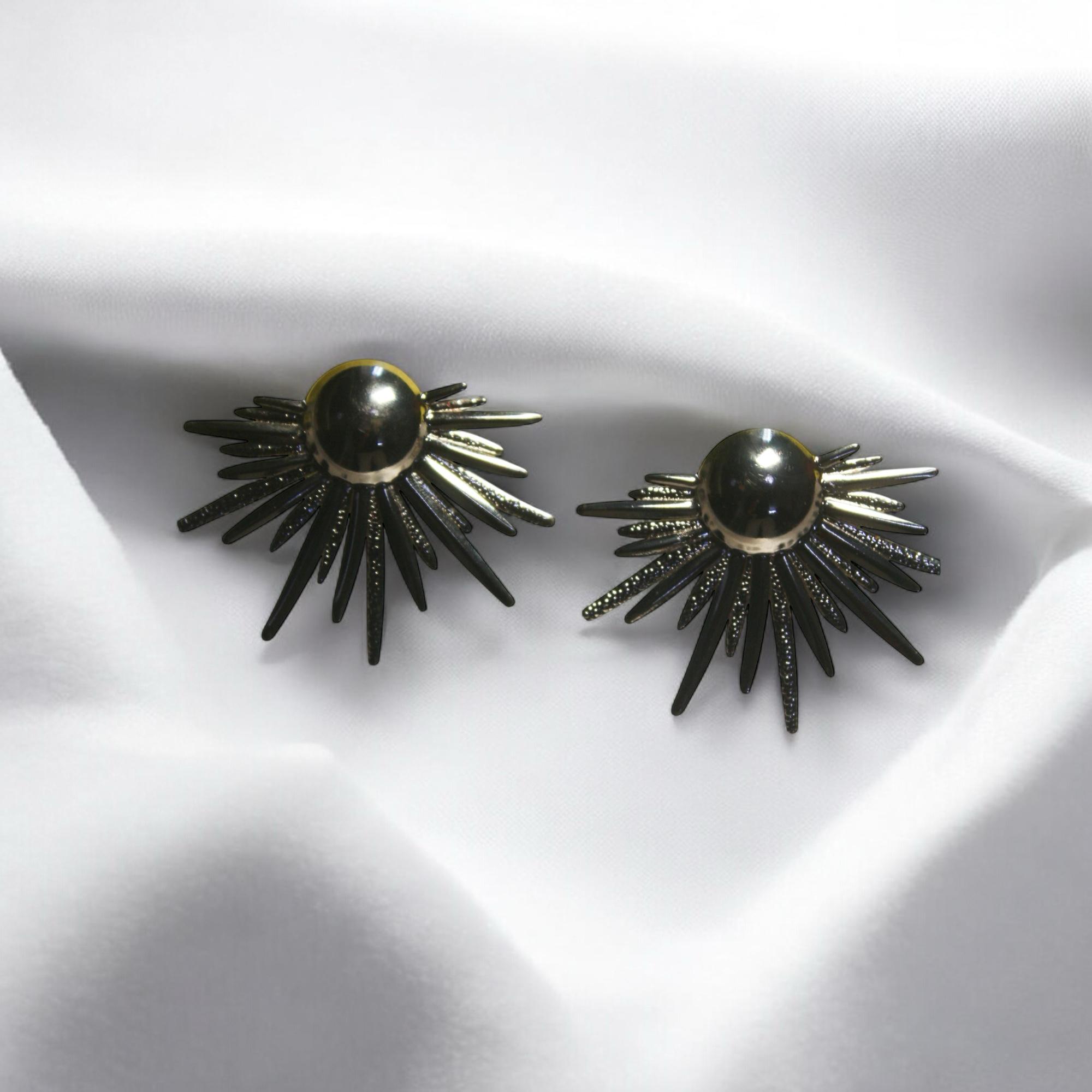 Midnight Radiance Earrings. Designed with a striking black sunburst silhouette, these earrings feature a high-shine domed center surrounded by sleek, tapered rays. The perfect blend of cosmic energy and contemporary glamour, they’re ideal for night outs, special occasions, or adding drama to your everyday look.
