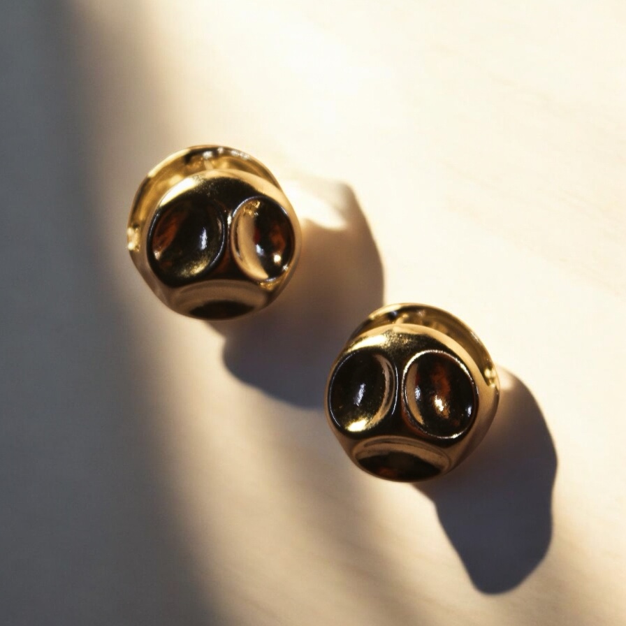 Noir Stud Earrings. Featuring a bold dome shape and sleek black enamel detailing, these earrings bring a cosmic edge to your everyday style. The glossy gold finish adds a touch of luxury, while the rounded design makes a strong, modern statement. Perfect for those who love minimalist jewelry with a unique twist.