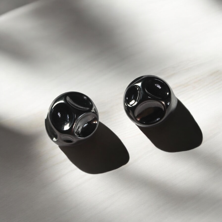 Noir Stud Earrings. Featuring a bold dome shape and sleek black enamel detailing, these earrings bring a cosmic edge to your everyday style. The glossy silver finish adds a touch of luxury, while the rounded design makes a strong, modern statement. Perfect for those who love minimalist jewelry with a unique twist.