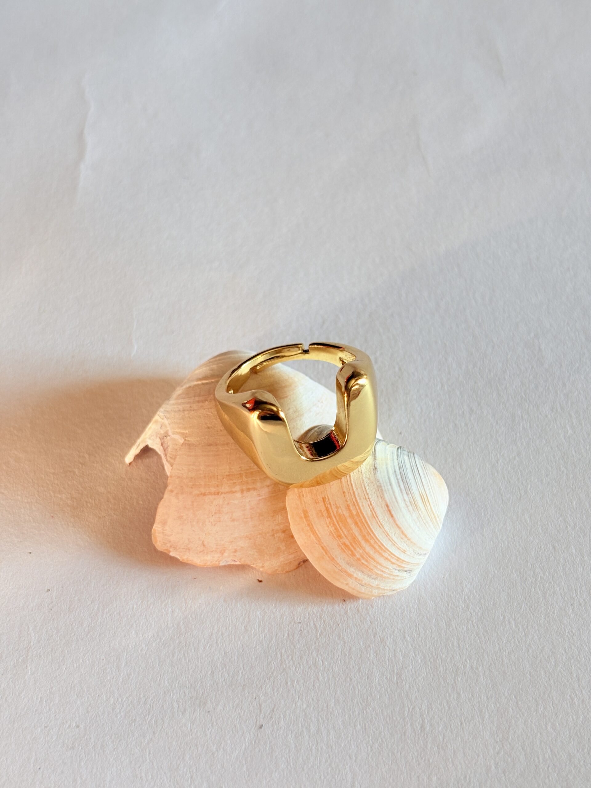 The Vault Ring is where structure meets shine. With its striking geometric contour and polished gold-tone finish, this piece is designed for those who appreciate bold minimalism. The curved front dips into a soft groove, creating a distinctive silhouette that catches light and attention. Whether you’re dressing up or keeping it casual, the Vault Ring adds a touch of contemporary sophistication to any look. It’s a power piece—confident, clean, and effortlessly cool.
